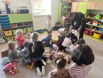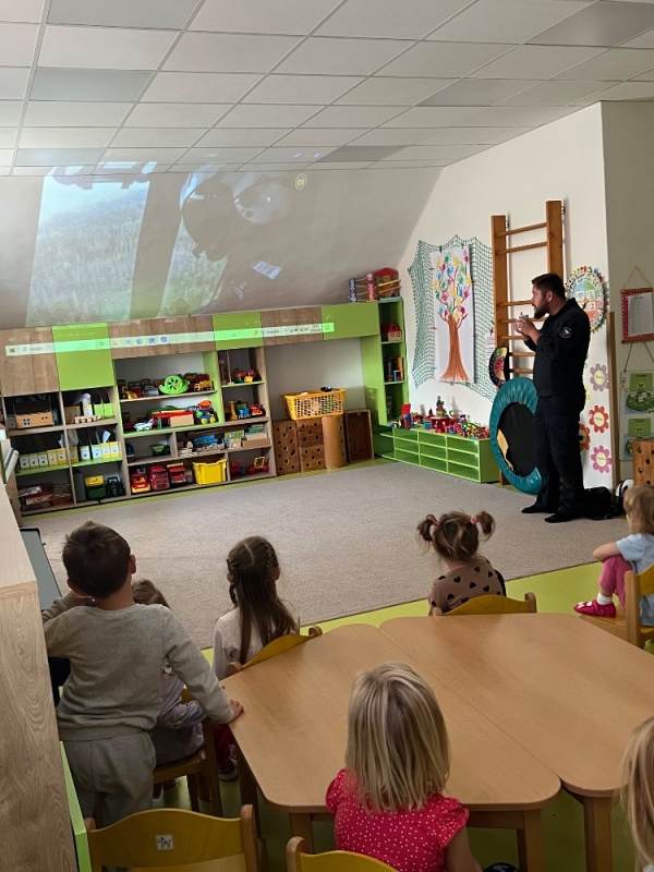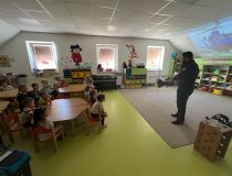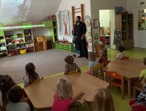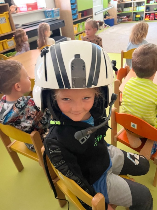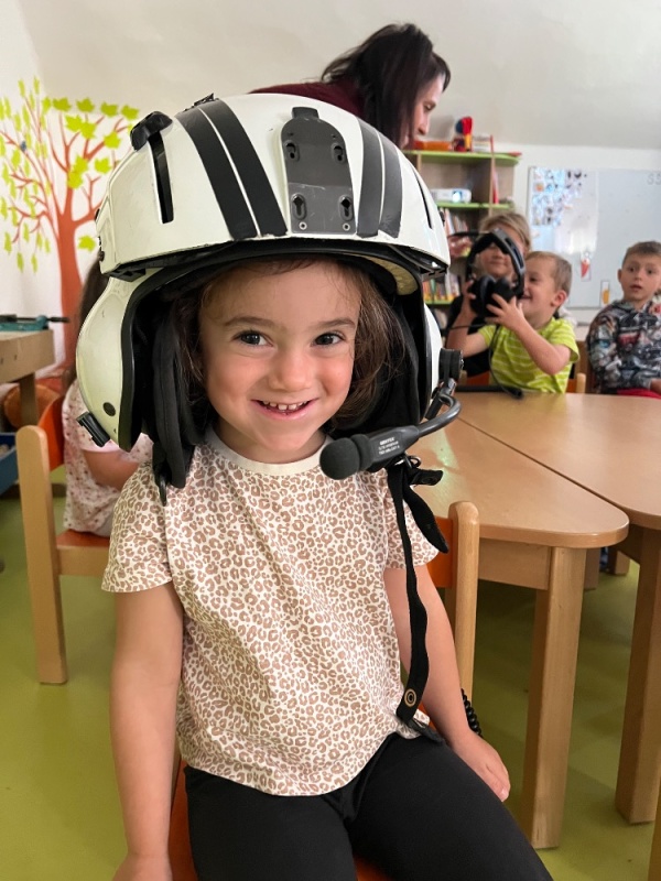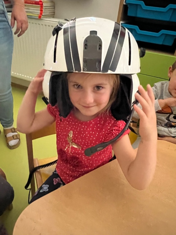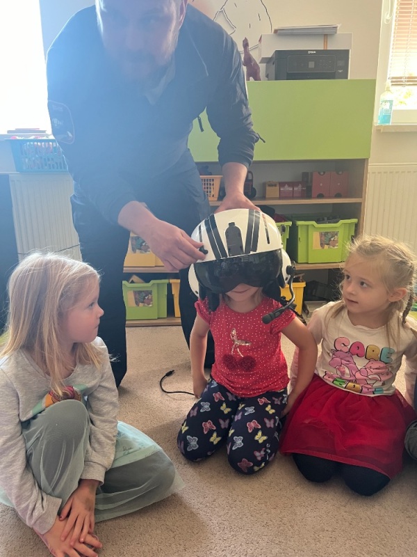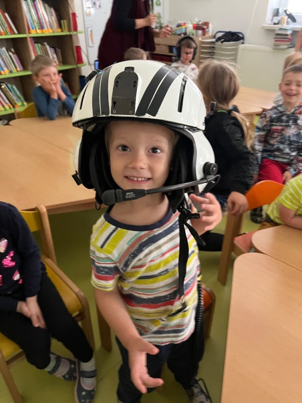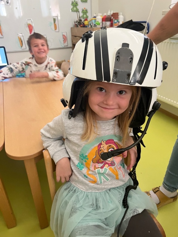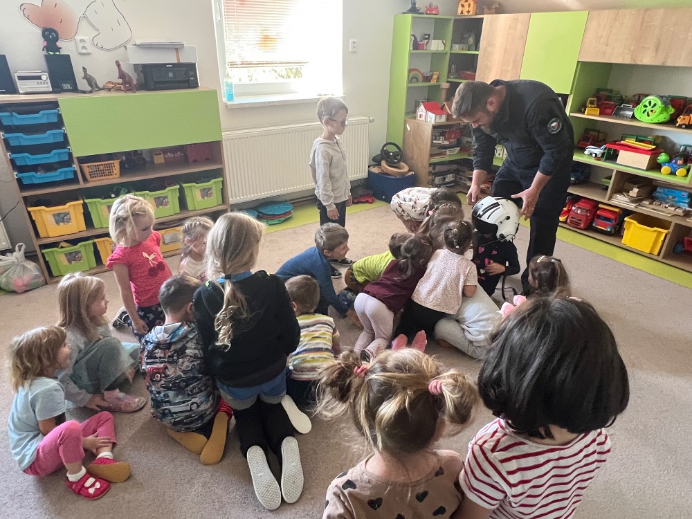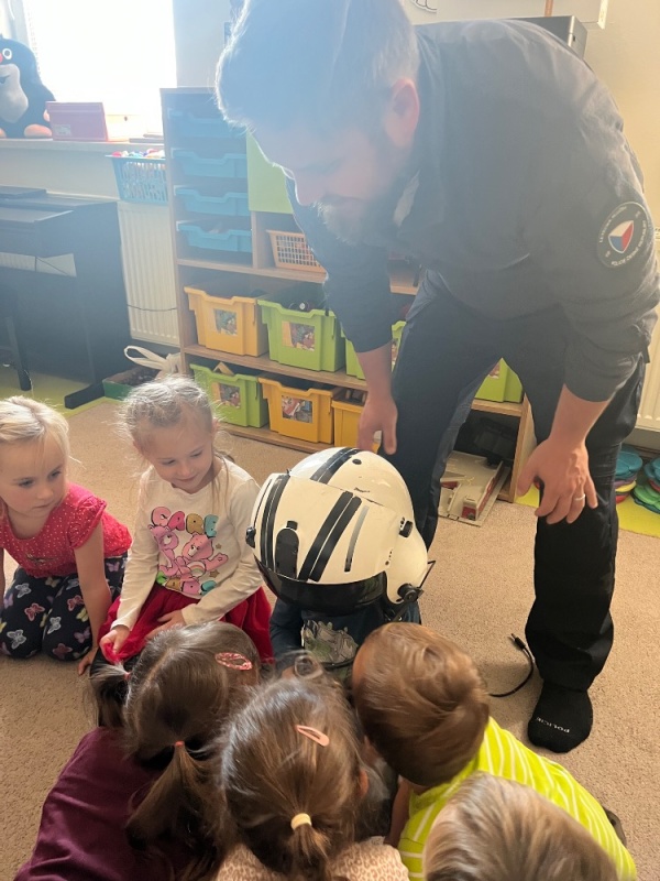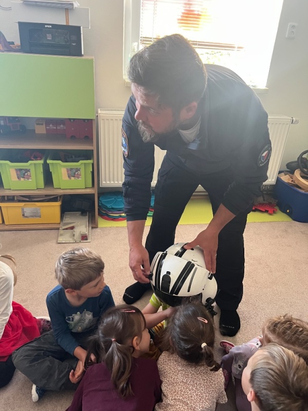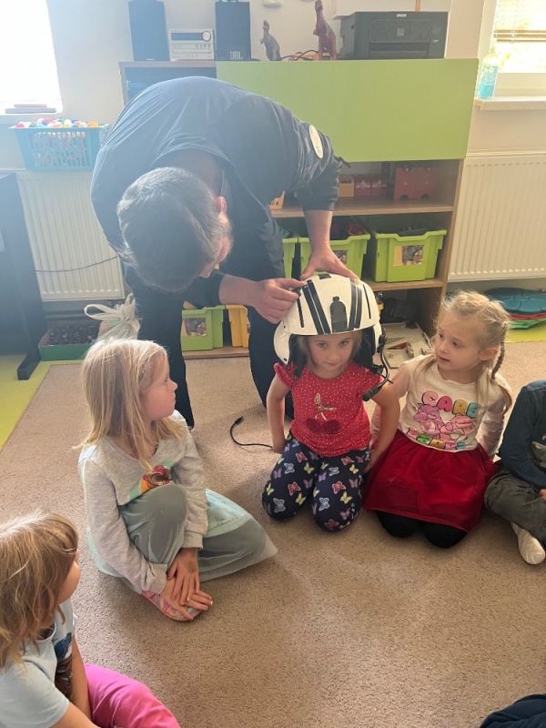 Dne 30.9.2025 k nám do školky dorazil pan Jan Dlesk s přednáškou o své práci. Pracuje jako policista-funkce palubní technik. Dozvěděli jsme se, jak se hasí požáry, jak vypadá vrtulník, jak se slaňují pro zraněné, a také jsme viděli na fotografii hangár plný vrtulníků. Pan Dlesk nám ukázal, jak se zachraňují lidé v lese, například když se ztratí a mnoho dalších ižitečných informací.