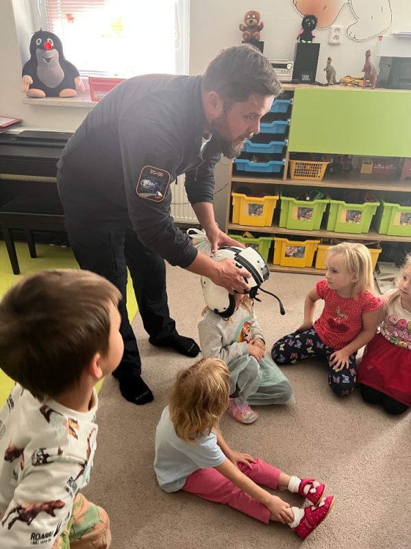 Přednáška byla doplněna projekcí fotografií a videí, takže byla velmi zajímavá a poučná. Děti si mohly vyzkoušet jeho helmu s mikrofonem, sluchátka i další výstroj. Také měly možnost položit několik otázek, na které pan Dlesk hezky odpověděl.