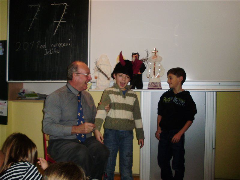 V předvánočním čase nás navštívil p.uč. Hájek, který dětem poutavým způsobem přiblížil historii Vánoc a oživil zvyky a staré obyčeje. Děti se seznámily s postavami jako je Lucie, Amrož, Barbora, Mikuláš. Ukázal také , jak se dělají ozdoby ze slámy.