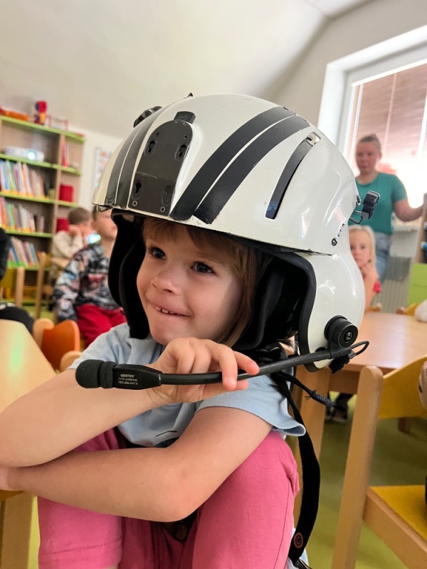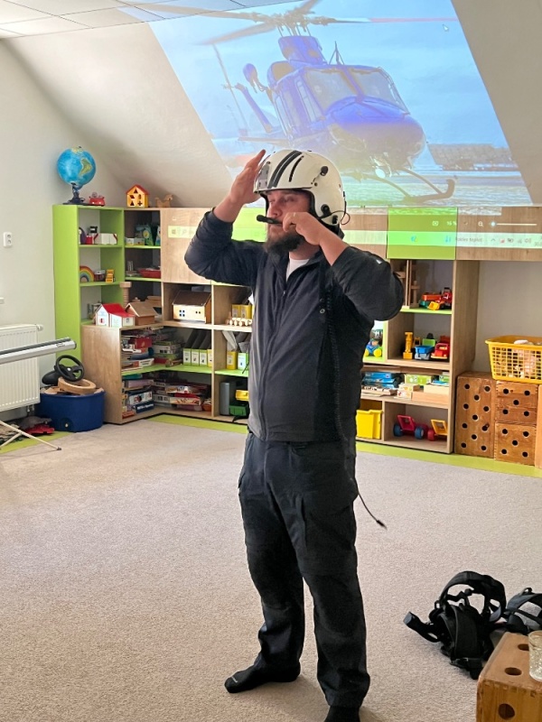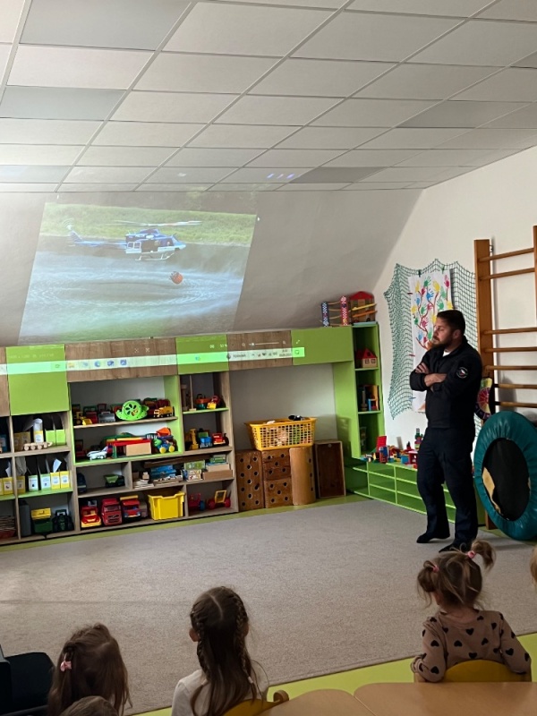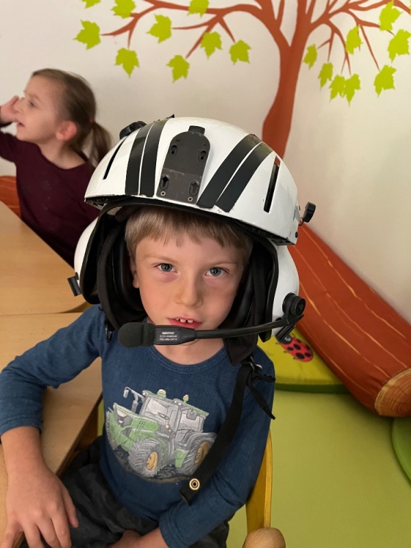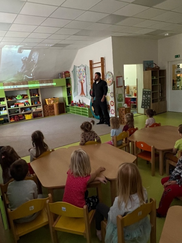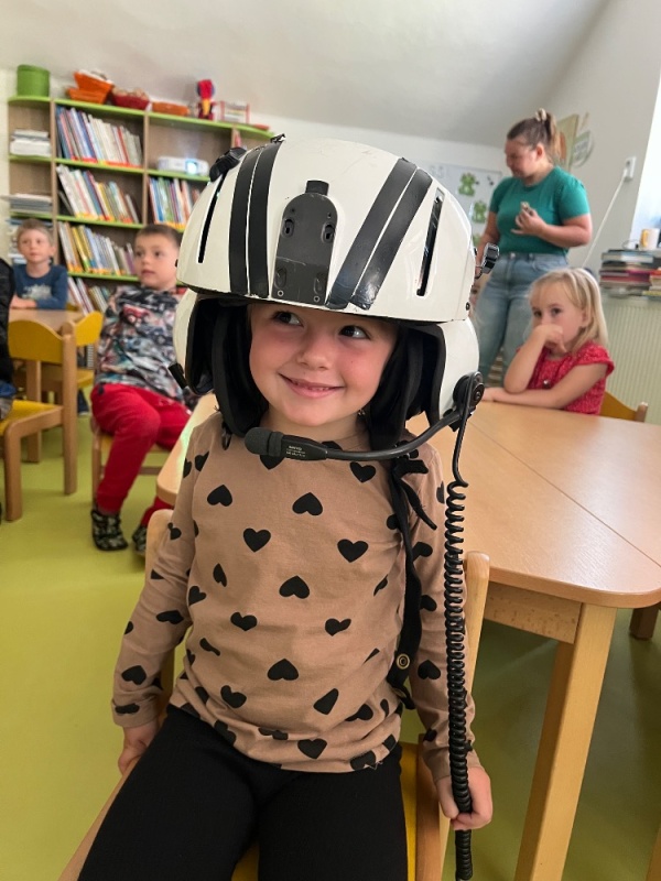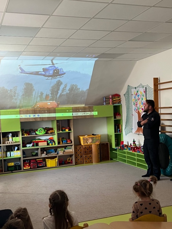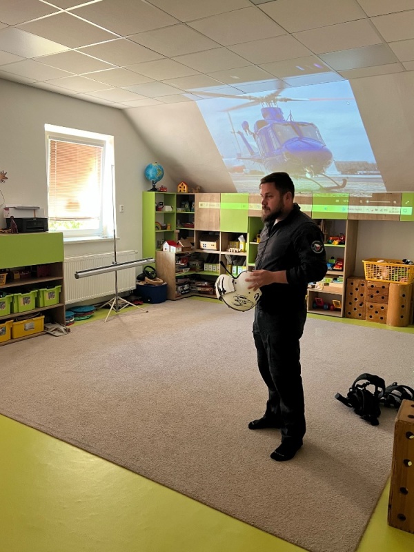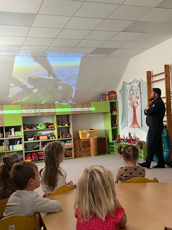 Dne 30.9.2025 k nám do školky dorazil pan Jan Dlesk s přednáškou o své práci. Pracuje jako policista-funkce palubní technik. Dozvěděli jsme se, jak se hasí požáry, jak vypadá vrtulník, jak se slaňují pro zraněné, a také jsme viděli na fotografii hangár plný vrtulníků. Pan Dlesk nám ukázal, jak se zachraňují lidé v lese, například když se ztratí a mnoho dalších ižitečných informací.